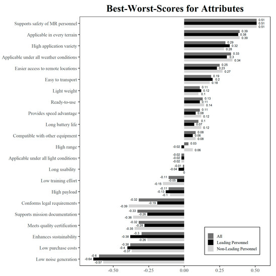According to [83], one of the main advantages of BWS, as compared to other common rating-based evaluation methods, is that it also accounts for information about negative evaluations. Hence, a positive best–worst score means that an attribute was evaluated as the most important attribute more often than it was as the least important, while the inverse leads to a negative best–worst score. The best–worst scores were calculated for the leading and non-leading rescue workers (rescue workers in training and general operational staff) separately in order to gain an initial idea about potential differences in attribute selections. A graphical representation of the survey results featuring the best–worst scores can be found in Figure 3.