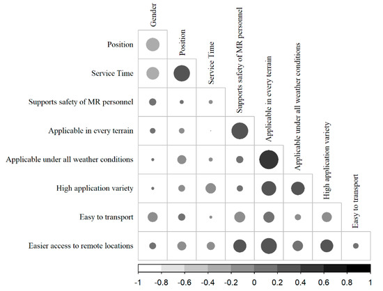 In Figure 4, we included the attribute “Gender”, and a negative correlation (corr = −0.25 at p < 0.001) between this attribute and the position within the MR service exists. This means that women are more likely to be in a lower ranking position within the MR service than men. Taking a closer look at this, however, reveals that women only have a “Service Time” of 5.2 years on average, while their male counterparts have been in MR for 17.3 years on average. In this context, it has to be pointed out that, in the sample, there were only 22 female respondents, and 13 of them were relatively new to MR (service time ≤ 3 years). Additionally, of interest is the position of the “Supports safety of MR personnel” attribute. The applicability of the e-mobility transport solution in every terrain correlates (corr = 0.39 at p < 0.001) with the perceived safety support. Additionally, “Easier access to remote locations” (corr = 0.24 at p < 0.001) features a similar relationship. Another interesting finding from analyzing attribute correlations is that “Position” and “Conforms to legal requirements” (corr = 0.28 at p < 0.001) are positively correlated. This means that personnel in leading positions assign more value to this attribute than the operational staff or the personnel in training.