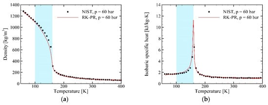Comparison of thermodynamic properties of RK–PR equation of state to National Institute of Standards and Technology (NIST) data for pure oxygen at 60-bar pressure: (a) temperature verses density; (b) temperature verses isobaric specific heat.