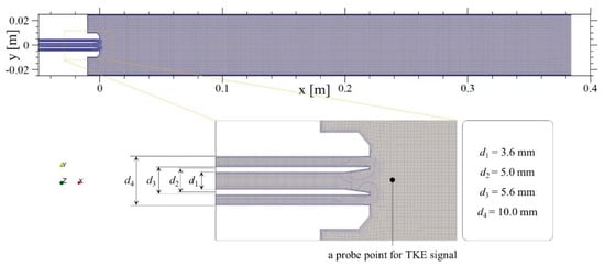Grid overview with close-up view of injection region. d1: diameter of circular oxidizer pipe for straight section, d2: diameter of circular oxidizer pipe at exit, d3: inner diameter of annular fuel pipe, d4: outer diameter of annular fuel pipe.
