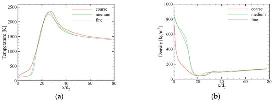 Time-averaged flow properties along central-axis with different grid resolution: (a) mean temperature; (b) mean density.