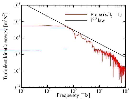 Frequency spectrum of turbulent kinetic energy (TKE) at a probe point (x/d2 = 1). Abscissa and ordinate axes are expressed in log scale, respectively.