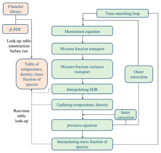 In this study, SLFMFoam_LES implemented on OpenFOAM, an open source platform, is used as the main reacting flow solver. This solver is developed based on both the SLFM and the PIMPLE algorithm, focusing on an LES of turbulent combustion. PIMPLE combines the SIMPLE (Semi-Implicit Method for Pressure-Linked Equations) steady-state flow algorithm [30] with the PISO (Pressure Implicit with Splitting of Operator) unsteady flow algorithm [31]. The detailed structure of SLFMFoam_LES is depicted in Figure 6. The solver has a structure that solves momentum, mixture fraction, and mixture fraction variance equations in order, and then calculates SDR. Then, the solver performs linear interpolations on the mixture fraction, mixture fraction variance, and SDR to obtain the temperature and density from the flamelet table. Because this solver is built upon the pressure-based segregated algorithm, as depicted in Figure 6, it solves the pressure equation based on the number of inner corrections and repeats the outer correction according to the nature of the SIMPLE algorithm. If the convergence limit is reached, the calculation moves on to the next time step.