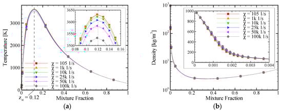 The range of SDR constructed on the flamelet table is 105–105. Figure 7 illustrates two scalar variables, i.e., temperature and density, according to the mixture fraction obtained from the table construction. Figure 7a is the temperature graph and it illustrates that the stoichiometric mixture fraction value is positioned near = 0.12. At this location, the temperature reaches close to the constant-pressure adiabatic flame temperature of 3627 K. Figure 7b is the density graph and it illustrates a significant density variation near = 0–0.004. This mixture fraction range is where isobaric specific heat displays a singularity—as heat energy is generated, the fluid experiences a volumetric expansion rather than a rise in temperature in this range.