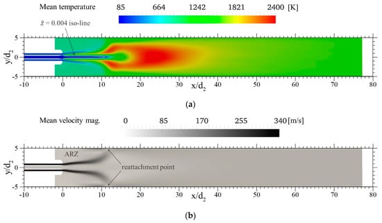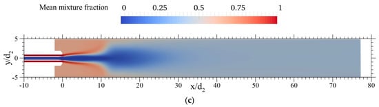 Longitudinal slices of time-averaged fields: (a) static temperature; (b) velocity magnitude; (c) mixture fraction (Sct = 0.7). Coordinates of computational domain are non-dimensionalized by diameter of circular oxidizer pipe at exit (d2).