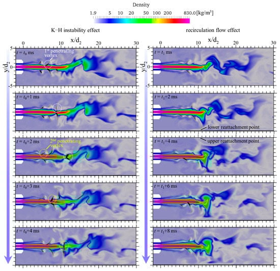 In Figure 9b, the intact oxygen jet flows at t1 ms, and the recirculation zone described in Figure 8b is placed outside the hydrogen jet. At + 2 ms, the lower part of the oxygen jet begins to be sucked toward the lower reattachment point by the lower recirculation flow. The sucked portion of the jet reacts with the recirculation flow to produce an intermediate heat release rate. At + 4 ms, the upper part of the oxygen jet is weakly sucked toward the upper reattachment point by the upper recirculation flow. At + 6 ms, the oxygen jet is split by the combination of the recirculation and the K–H instability. At + 8 ms, the oxygen jet is returned to its intact state.