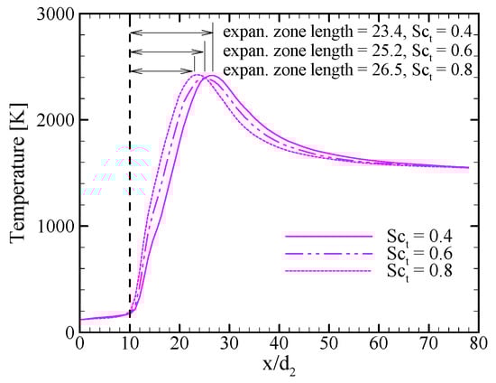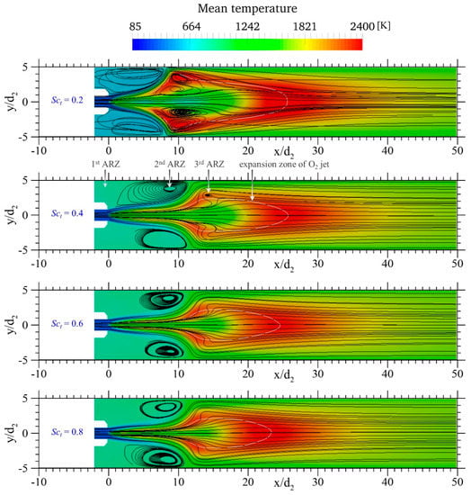 Figure 10 shows the longitudinal slices of the time-averaged temperature field overlapped with the streamline for the turbulent Schmidt number in the range 0.2–0.8 with an interval 0.2, and the white iso-line corresponding to the time-averaged mixture fraction of 0.2 is plotted for each slice. This iso-line is the edge of the expansion zone of oxygen plotted in Figure 10, and this expansion zone (i.e., the inside of the white iso-line) is where the oxygen jet core suddenly begins to expand and stops expanding.