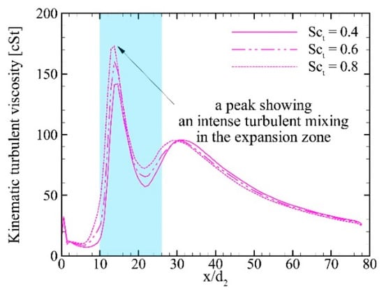 Time-averaged kinematic turbulent viscosity along central-axis for different turbulent Schmidt numbers.