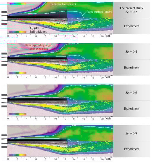 The flame of the simulation for = 0.2 differs significantly from that of the experimental image. The OH distribution of = 0.2 is noticeably wider and thicker than the other three cases ( = 0.4, 0.6, 0.8). The half-thickness of the oxygen jet is also significantly thicker than that of the experimental image.