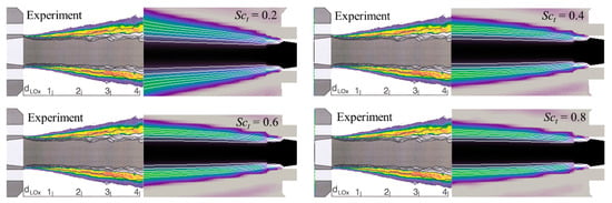 Figure 13 is a close-up view of the OH field near the injector. The contour lines of the time-averaged jet position are depicted in the experimental OH image. In the experiment image, the central gray region is where the jet is continuously present along the line of sight, and the dark gray contour lines are, respectively, 0.875, 0.75, 0.625, 0.5, 0.375, and 0.25 times the maximum jet existence time as it is farther away from the central-axis. The jet’s contour lines are similarly represented in the simulation image. The white contour lines in the simulation image represent the oxygen mass fraction values of 0.875, 0.75, 0.625, 0.5, 0.375, and 0.25 as it moves farther away from the central-axis. At = 0.2, the flame-spreading angle of the simulation image is larger and the distribution of contour lines is wider than those of the experiment. Therefore, the difference is larger compared to the other turbulent Schmidt number cases. At = 0.8, the flame spreading angle is smaller, and the distribution of contour lines is narrower, than those of the experiment. In contrast, = 0.4, 0.6 agree closely with the experiment. More precisely, = 0.4 has the closest resemblance.