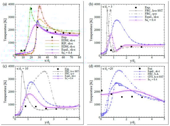 Figure 15 illustrates the time-averaged temperature profiles—one along the central-axis and the other three along the radial direction at several locations ( = 3, 10, and 20) for = 0.4—and compares these profiles with those of previous studies. The experimental data are measured using CARS, and each probe point is averaged over 225 samples for 15 s.
