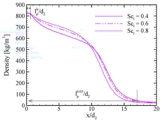 The remaining three slices are different from = 0.2 in the flow and flame structures, and they have apparently similar structures. However, the streamline illustrates that, for = 0.4, the third small recirculation zone exists, whereas in the cases of = 0.6 to 0.8, the third small recirculation disappears. The generation of this third small recirculation is related to the size of the expansion zone of the oxygen jet: the size of the third recirculation zone increases with that of the expansion zone. The expansion zone’s size decreases as the turbulent Schmidt number increases. Another notable turbulent Schmidt number effect is the streamline pattern in the downstream region after the expansion location (/ > 10). As the turbulent Schmidt number increases, the streamline is less parallel to the -axis and is curved inwards. As the turbulent Schmidt number increases, the specific volume behind the expansion location decreases more drastically due to the strong mixing between the two propellants, i.e., unburnt hydrogen gas flowing toward the outlet via the reattachment point and the oxygen in the expansion zone. Figure 11 supports this fact by showing the kinematic turbulent viscosity is the highest at = 0.8 over the flame expansion zone painted in bright blue (/ = 10–26).