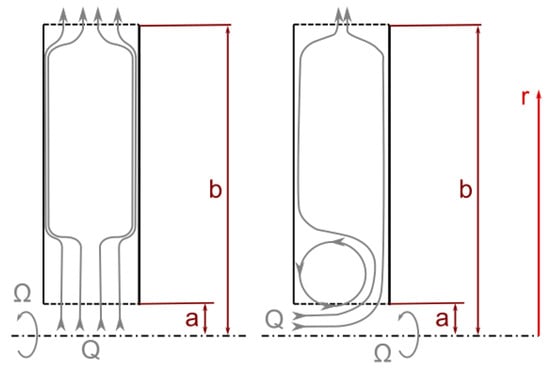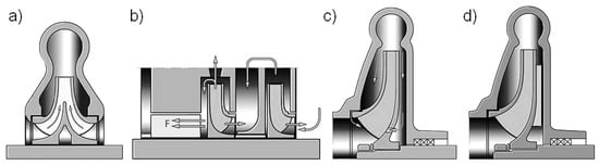 - Kurokawa, J.; Toyokura, T. Study on the Axial Thrust of the Radial Flow Turbomachinery: 1st Report, Effects of the Main Parameters. Trans. Jpn. Soc. Mech. Eng. 1975, 41, 1753–1762. [Google Scholar] [CrossRef]