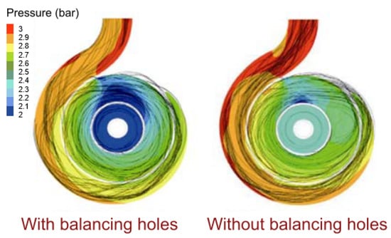 - Cao, W.D.; Dai, X.; Hu, Q.X. Effect of impeller reflux balance holes on pressure and axial force of centrifugal pump. J. Cent. South Univ. 2015, 22, 1695–1706. [Google Scholar] [CrossRef]