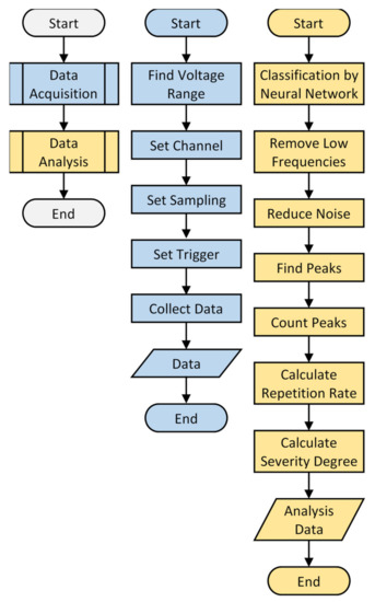 To make use of the functionalities of the PicoScope in Python language, the library “pico-python” [21] was used as interface with the manufacturer’s drivers to communicate and set the oscilloscope acquisition parameters. In addition to the fundamental Python packages—NumPy, SciPy and Matplotlib—the algorithm also uses PyWavelets [22] to implement wavelet transforms, and TensorFlow [23] to implement machine learning models though its official front end Keras [24]. A flowchart highlighting the main steps of the algorithm is shown in Figure 1.