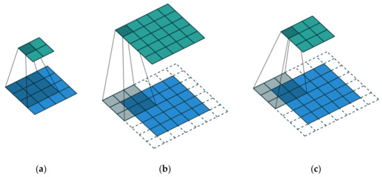 Impact of stride and zero-padding on data dimensions, showing input data in blue, the filter kernel as the shaded area over the input data, and the output data in green: (a) a stride of 1 is used whereas zero-padding is not used, causing the data dimensions to shrink; (b) a stride of 1 is used along with zero-padding (dotted elements), keeping the output data dimensions the same of those of the input; (c) a stride of 2 is used, causing the data dimensions to shrink by half [25].