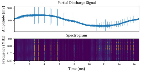 Example of a partial discharge signal in time domain (top) and its spectrogram (bottom).