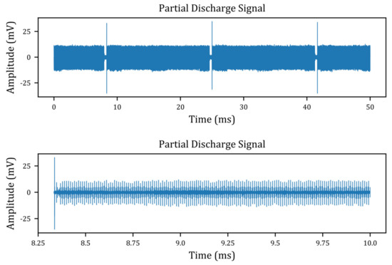 Example of a signal collected at a substation, referenced to three power frequency cycles (top) and in detail showing individual partial discharge pulses (bottom).