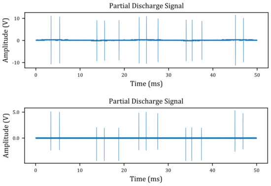 Examples of partial discharge signals collected during laboratory tests using a radiofrequency antenna (top) and using an HFCT (bottom).