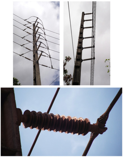 Another region of the city which could possibly be critical is the cargo port, since it is a site for the boarding of iron ore for the mining industry, and the insulators of that region constantly become covered in mine dust, as well as all structures and buildings in the surrounding area of the port, which constantly present a visible reddish dust deposit. Partial discharges were detected by the RF sensor and by the HFCT, since, in this case, the inspected structure had its grounding conductor exposed. However, the PD activity observed in the surrounding area of the port was not so severe as that observed in the previous region. Figure 8 shows the general layout of the concrete structures, and some of the insulators used in the utility’s system.