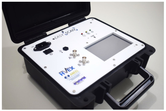 The system power is supplied by a rechargeable battery, which is connected to an energy management circuit. This circuit is responsible for controlling the power supplied to the components and the battery charge. All these pieces of equipment are placed inside a protective equipment case provided with a panel comprising the touch screen display, a power switch, the AC power connector, a USB connector to collect data, and a BNC connector to which the antenna is attached to at the time of the inspection. The assembled portable instrument (portable software-hardware system) is shown in Figure 10.
