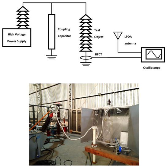 The setup used in this test was the same used by the standardized tests, consisting of a coupling capacitor in parallel with the test object and a quadrupole, as recommended by standard IEC 60270:2000 for high-voltage test techniques for partial discharge measurements. The insulator defect was simulated by means of a spark gap built with a rigid wire connected between the electrodes of the insulator.