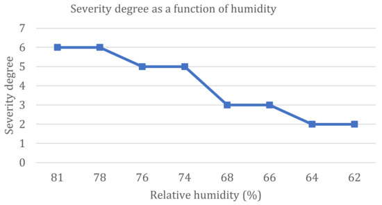 The partial discharge activity pattern, i.e., the pulse density would lower according to the decrease of the relative humidity inside the chamber. It was also possible to observe the similarities between these signals and the patterns observed in the field from the naturally polluted insulators. After acquisition, the signals were subjected to analysis by the developed algorithms, aiming to assess their performance and the conformity of the proposed severity degree. Considering the solid layer with the corresponding pollution for the month of October, the severity degree as a function of humidity is shown in Figure 12.