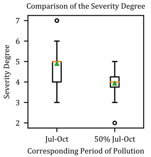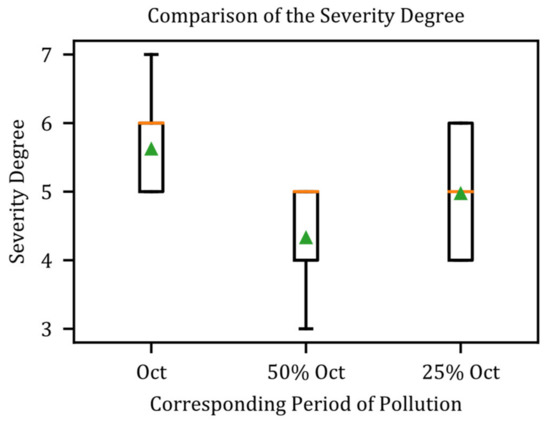 In addition to that, considering the ESDD for the month of October, approximate time periods equivalent to two weeks (50% October) and one week (25% October) were considered by using the percentage amounts of NaCl. In this case, the fog generators were turned on for a short period, between 5 and 10 min, until the measured relative humidity inside the chamber reached a value around 85%, and then turned off before applying nominal voltage to the test object. The results of the severity degree for values of relative humidity above 70% for this case are shown in Figure 14.