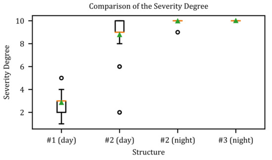 Considering the working hours of the utility’s team, the FIS should be calibrated to generate the maximum severity degree for the worst condition observed during daytime. This means that worse conditions observed during nighttime should be assigned a severity degree of 10. This behavior can be observed in Figure 15, especially regarding the second structure, which had been inspected both during daytime and nighttime. The third and most critical structure with respect to PD activity had been inspected only during nighttime, and presented visible arcing, also confirmed by the residents of that region. Therefore, for this last case, all data samples produced a severity degree of 10.