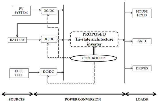The proposed 485-level tri-state inverter can be used in photovoltaic and fuel cell power generation systems (Figure 1). A series of fuel cell or Photo Voltaic arrays can be connected to match the magnitude of voltage sources in the proposed inverter. The proposed tri-state inverter feeds the power to the load. The inverter was designed to operate at grid frequency.