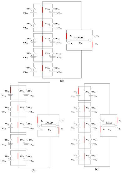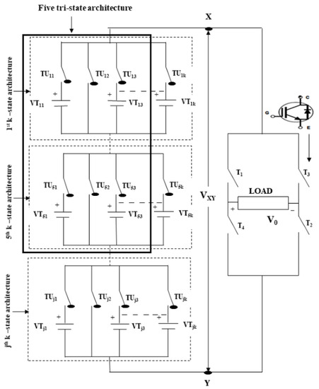 Consider the architecture shown in Figure 2, which can generate ‘k’ number of states from every structure. More voltage levels are built by cascading ‘j’ number of such units. The switching combination for the k-state architecture is mentioned in Table 1. Only a single switch will be turned on in each k-state architecture at a particular time to generate a voltage level. Therefore, to generate a maximum voltage between the nodes ‘X’ and ‘Y’ (Figure 2), the number of switches to be turned on will be equal to ‘j.’ The input voltage source connected to generate a maximum voltage between the nodes ‘X’ and ‘Y’ is also equal to ‘j’. The shaded portion in Table 1 indicates the ‘ON’ status of the switch in the jth structure. For example, zero voltage state is realized by turning on ‘TUj2’, voltage is realized by turning on ‘TUj1,’ and voltage is realized by turning on ‘TUjk’. Magnitudes of DC sources in each unit are selected as: 0, , …, (‘j’ = number of k-state units and y = 1, 2,…). With these values, the voltage obtained between the nodes ‘X’ and ‘Y’ is given in Equation (1).