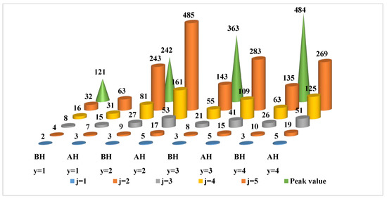 Peak value, variations of the number of levels with respect to ‘y’ (BH-Before H bridge, AH-After H bridge).