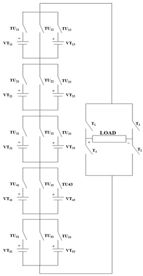 Figure 4 shows the development of a 485 level tri-state inverter by cascading five tri-state architectures. Using Equations (2) and (3), 19 controlled switches and 10 DC sources were required to construct 485 voltage levels. DC source values were obtained from Equations (7) and (8). VT11, VT21, VT31, VT41, and VT51 are taken as 1 V, 3 V, 9 V, 27 V, and 81 V. The voltage values of VT12, VT22, VT32, VT42, and VT52 are considered as zero. The voltage values of VT13, VT23, VT33, VT43, and VT53 are considered as 2 V, 6 V, 18 V, 54 V, and 162 V, respectively, to design a 485 level tri-state inverter.