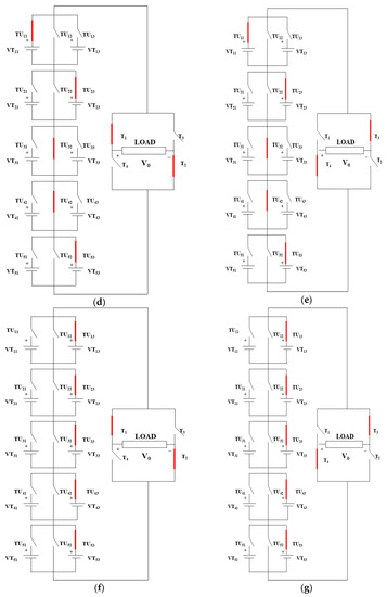 The switches TU13, TU23, TU33, TU43, TU53, T1, and T2, are to be turned on to achieve the 242th positive level at the output, shown in Figure 5f. From the Figure, the voltage source VT13, VT23, VT33, VT43, and VT53 are connected to the load, and the output voltage obtained is +242 V. To construct corresponding negative voltage, TU13, TU23, TU33, TU43, TU53, T3 and T4 are to be turned on which is shown in Figure 5g.