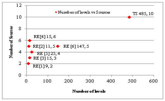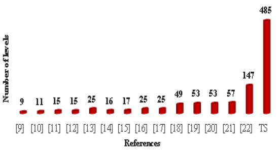 The variety of inverters designed in References [9,10,11,12,16,22] are named as RE [1], RE [2], RE [3], RE [4], RE [5], RE [6]. Table 6 compares the existing MLI with the proposed inverter (TS) in terms of the number of structures. In RE [1], two variable DC supplies are utilized to develop a nine-level at the output, and in RE [3], three sources are used to generate the fifteen level in the output voltage. RE [2] and RE [6] utilize the five sources and generate 11 and 147 voltage levels, respectively. RE [4] proposes a fifteen level MLI with six sources. Further, RE [5] fabricates 25 levels MLI using four voltage sources.