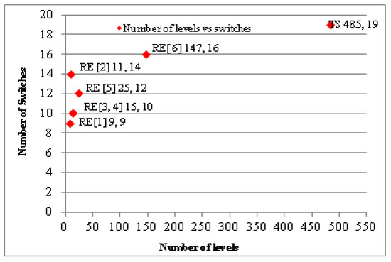 The plot for the utilization of switches with respect to the number of output voltage level generation is shown in Figure 7. The plot shows that RE [1] constructs nine-level output using nine switches. RE [3] and RE [4] utilize ten switches to produce fifteen levels at the output. RE [2], [5], and [6] use fourteen, twelve, and sixteen switches to produce eleven, twenty-five, and one hundred and forty-seven output levels, respectively. Whereas, in the proposed work, nineteen controlled switches were required for producing four hundred and eighty-five voltage levels at the load.