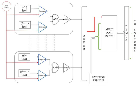In order to generate a multilevel in the output voltage, it needs the control pulse generation for the switches. Figure 10 shows the block diagram of the generation of pulses, which is achieved by comparing the sinusoidal wave with the constant voltage steps at regular intervals. The switching state will become one when sinusoidal is in between the ith level and i + 1th level. For 242 level generation, the value of ‘i’ will be varying from 0 to 242 (i.e., from ith level to n + 1 level) to construct positive 242 levels, and the same will be repeated for negative. Adder will combine all the switching states created, and it will act as an input to activate the corresponding switching pattern via a multiport switch. De-multiplexer is used for distributing the pulses for the switches in the tri-state inverter.
