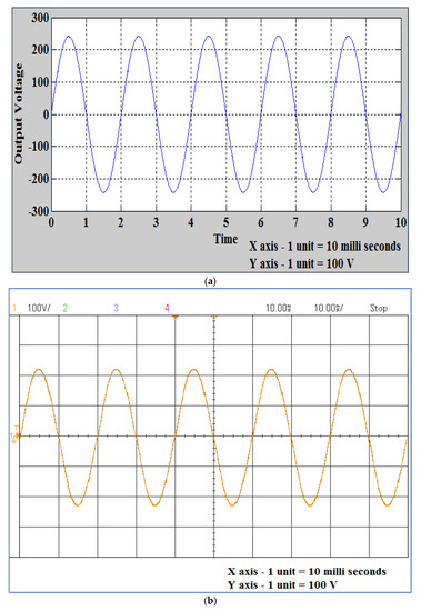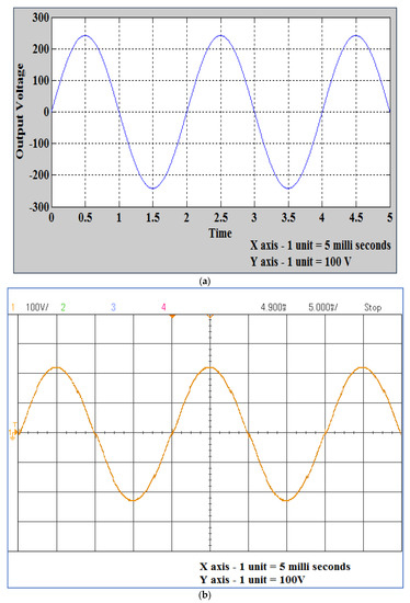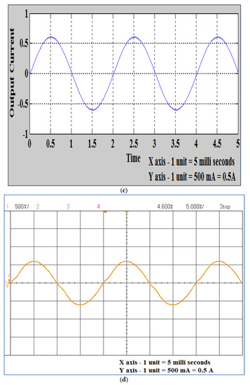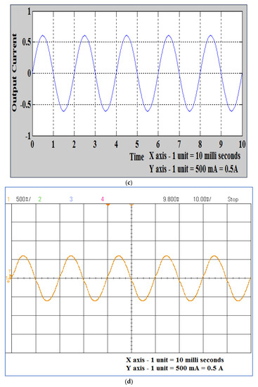 The output voltages and the current waveforms are obtained satisfactorily from the simulation and experimental design for resistive loads, and they are shown in Figure 12a–d, respectively.