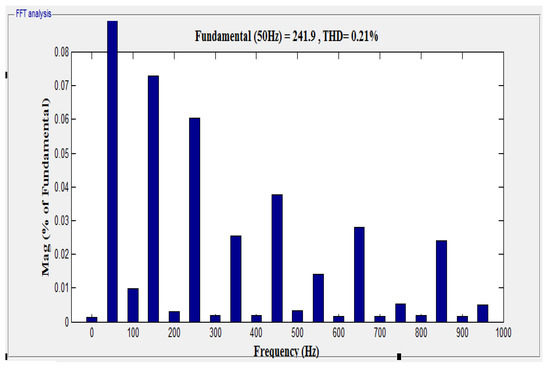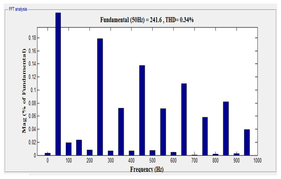 The simulation design and experimental development were tested with resistive and impedance load, which produces a maximum output voltage of 242 V and the maximum current value of 0.605 A, respectively. The waveforms are shown in Figure 12 and Figure 13. The frequency spectrum of the output voltage for the resistive load and impedance load was analyzed using the Fast Fourier Transform, and the harmonic contents for both the loads are obtained as 0.34% and 0.21%, which are shown in Figure 14 and Figure 15, respectively.