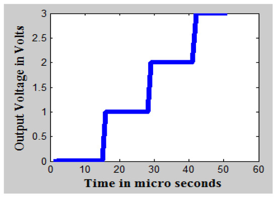 From Table 4, the device connected with a 162 voltage source is switched on for the MSB, the device connected with zero voltage source is turned on for the fourth bit as well as for the third bit, the device connected with six voltage source is turned on for the second bit, and the device connected to one voltage source is turned on for the first bit.