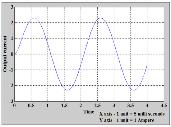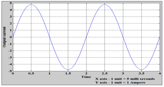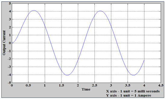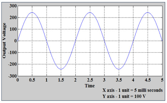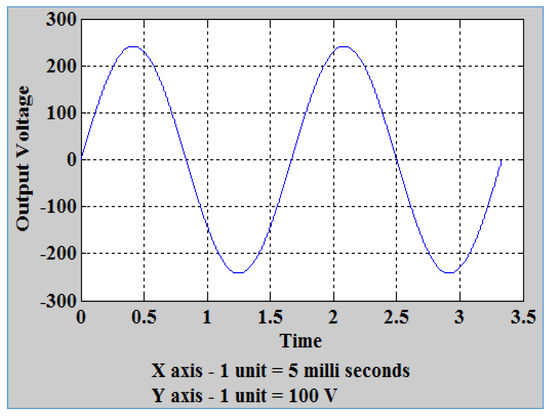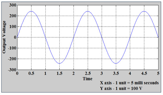 The proposed inverter was tested for an output frequency of 60 Hz. The simulation work is carried out for 60 Hz, and it is clearly observed from the waveform shown in Figure 25.