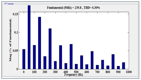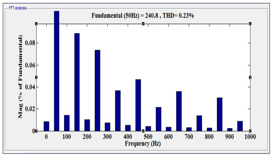 The output voltage and current waveform for (100 + j31.4) ohm load are shown in Figure 22 and Figure 23. By comparing the output voltage and current waveform, it has been inferred that the current waveform has a phase shift of 17.43° (lag), maintaining a power factor of 0.9541 at the output. The presence of harmonic content at the load voltage is measured as 0.23%, and it is shown in Figure 24.
