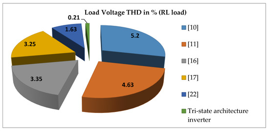The result of the tri-state architecture inverter was compared with other MLI’s in terms of harmonic content present in voltage waveform. The values in Table 8 are presented from various MLI designs tested with impedance load. From Table 8 and Figure 26, it can be concluded that the presence of harmonic contents in output load voltage is less than the other MLI designs.