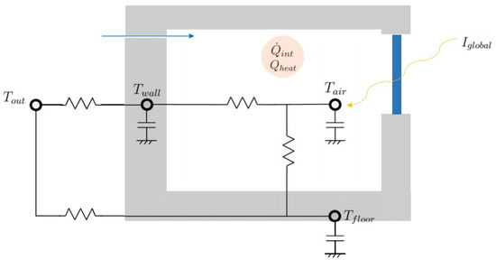 In the case of space heating, the inside air temperature , the wall temperature and the floor temperature are the state variables while the outside temperature , the solar irradiation I, the internal gains and the heating are considered as exogenous parameters. The space heating state space model is represented in Figure 1. The system of differential equations is defined based on an equilibrium equation for each temperature node that can be written as: