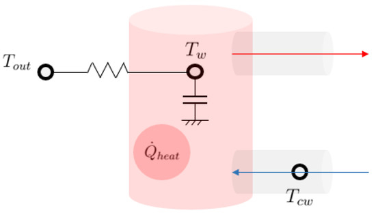 where is the thermal capacity of the water tank, the overall heat transfer coefficient between the inside and outside of the tank, the specific thermal capacity of water and the specific hot water consumption determined by the domestic hot water demand.