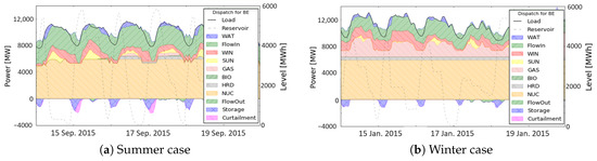 Figure 4a shows the optimal dispatch in some summer days which were most critical for curtailment. It has to be noted that in the base case scenario, curtailment did not arise from an excess in renewable availability compared to the demand but was due to the non-flexibility of the nuclear power plants. Base load units were unable to follow the residual load variations induced by renewable generation. This explains the fact that some curtailment took place in night time due to the reduced load in these hours. In the base case scenario, pumped hydro storage and other storage units provided most of the flexibility to the system. These units appeared to absorb a significant part of the excess energy and thereby reduce curtailment.