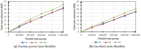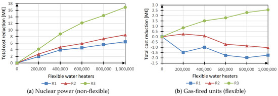 In the system configuration including nuclear power, Figure 5a shows that the more water heaters were made flexible, the higher the benefit in cost reduction. Moreover, increasing the renewable capacity also increased this cost reduction.