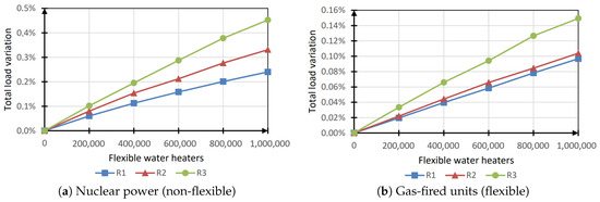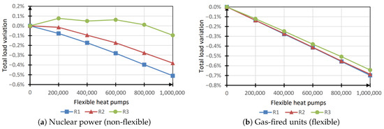 Figure 10a represents the obtained results for the total load variation in the case of flexible heat pumps. As for the water heaters simulations, the total power consumption was not significantly affected by the introduction of flexible heat pumps: in both nuclear and gas-fires units case, the variation was lower than the simulation accuracy (equal to 1%).