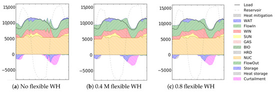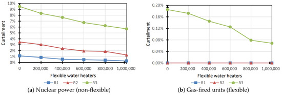 Figure 8 shows a typical day where curtailment occurred (R2—nuclear power configuration) for three penetration levels of flexible water heaters.
