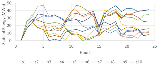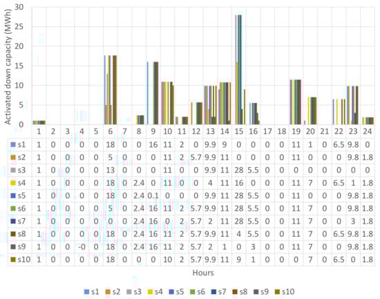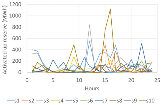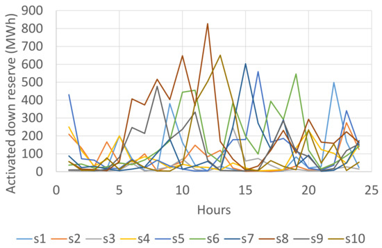 A strategic battery storage (energy capacity 50 MWh; power capacity 50 MW; charging efficiency 1; discharging efficiency 0.82) is then added to the mentioned merit order lists. The system operator in the second stage of the reserve allocation process takes the energy bids, arranges them by price (ascending for up reserve, and descending for down reserve) and activates them one by one until satisfying the balancing energy request at a specific moment. The request for the total activated energy is modeled as an uncertain parameter through scenarios. In the case study, we used the quarter-hour activated aFRR balancing energies taken from the German electricity data transparency platform www.smard.de. The quarter-hours were summarized to an hourly resolution to match the hourly resolution of our model. Note that the same data was also used in papers [27,28]. The data for ten days streaming form May 1 to 10 May 2020 were taken as ten scenarios in our case study. The up and down reserve activation data are shown in Figure 4 and Figure 5. To elaborate, each historical day (with all its hourly values) is shown as one scenario with a probability of 10%. The figures indicate a quite low activated volume, rarely surpassing 400 MWh, as compared to the reserved quantities from Table 2. Those scenarios affect our model results twofold: through the amount of activated reserve and through the price cleared for the activated reserve. In the case of batteries, the amount of activated reserve is relevant for securing a feasible state-of-energy evolution through time. It means that the state-of-energy boundaries will be satisfied regardless of which scenarios are actually realized. The price of activated reserves affects the profitability of reserve provision. The price maker models can be created in a way that their forecasted price is dependent on the activation scenarios as well, but they can not take into account the effect of the battery on the aFRR activated energy price formation.
